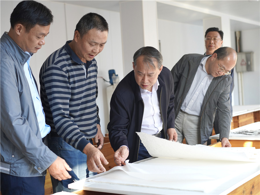 吳云忠對凝霜文化發展公司潛心挖掘徽州傳統文化,致力恢復徽州楮皮紙生產工藝表示充分肯定。吳云忠指出,造紙術是中國古代四大發明之一,對于文化記載傳承發揮了巨大作用;徽州楮皮紙制作工藝精湛,源遠流長,是徽州文化乃至中華文化的瑰寶之一;做好這項非物質文化的挖掘、保護、傳承、弘揚工作,意義重大,影響深遠。吳云忠強調,縣文化旅游部門要邀請專家并會同企業開展徽州造紙文化研究,進一步深挖徽州楮皮紙的歷史文化內涵和價值,全面恢復完善傳統制作工藝,大力培養一批非物質文化傳承人,確保傳統工藝薪火相傳;要結合旅游市場、文化市場需求,幫助企業推陳出新,精工制作,積極開發適應市場需求的文化旅游系列產品,打響徽州楮皮紙文化品牌。海陽鎮、經開區要統籌謀劃,主動服務,幫助企業解決規劃、用地、融資等方面存在的困難,支持企業健康發展,成為我縣文化產業的生力軍;要結合經開區十四五發展規劃,優化空間布局,提升園區環境,發揮集聚效應,努力開創文化產業發展新局面。徽州楮皮紙